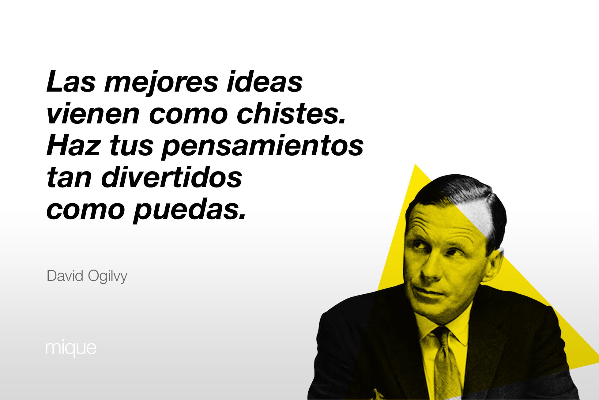 Estas frases célebres son las que hoy nos inspiran a nosotros. Son algunas de ellas las que hoy recogemos aquí para que puedan despertar, animar e invitar a esos talentos que aun, anónimos, están dispuestos a darlo casi todo por dedicarse al diseño gráfico.Lo dijo David Ogilvy, destacado publicista del siglo pasado: «Las mejores ideas vienen como chistes. Haz tus pensamientos tan divertidos como puedas». Imposible no mencionar la importancia de la diversión y del sentido del humor. ¿Qué es lo que hace que el consumidor retenga con facilidad una marca? ¿Qué es lo que difícilmente olvidamos? Aquello que nos hace reír. Está claro.